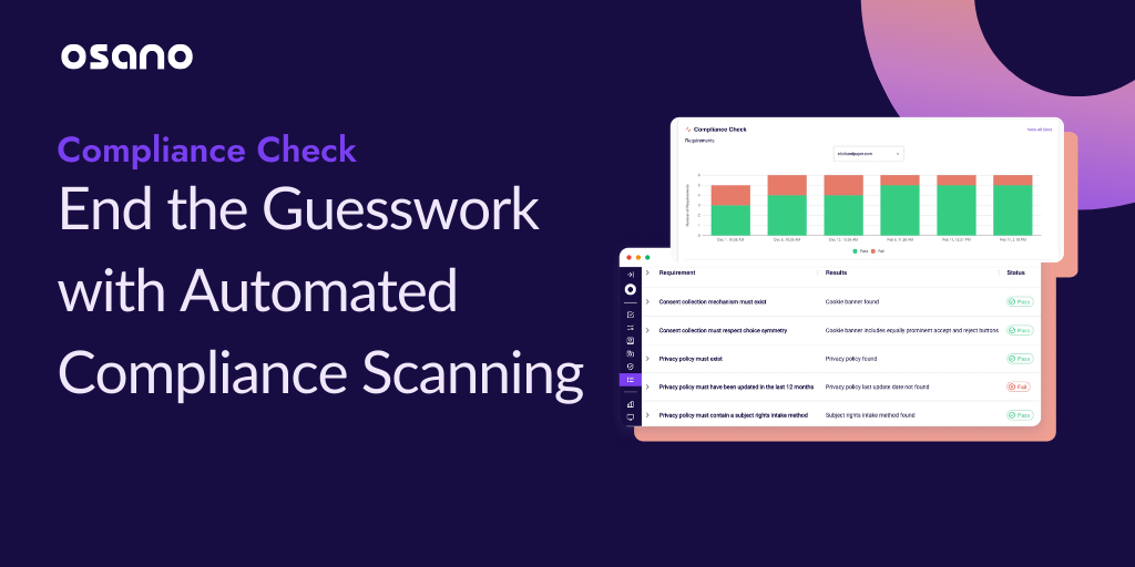 Don’t let blind spots in website design or maintenance create compliance risk. Osano Compliance Check continuously checks your sites or managed sites for dark patterns, technical framework adherence, up-to-date privacy policies, subject rights intake methods, and more. Gain clear visibility, ongoing assurance, and proof that nothing has slipped through the cracks.